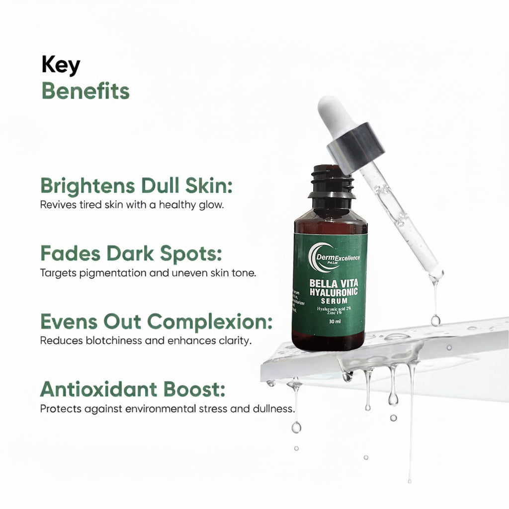 Give your skin the ultimate hydration boost with Derm Excellence Bella Vita Hyaluronic Serum, formulated with 2% Hyaluronic Acid and 1% Zinc to lock in moisture, restore elasticity, and promote a radiant, youthful glow. This lightweight, non-greasy serum penetrates deep into the skin, instantly replenishing hydration levels while improving skin barrier strength.